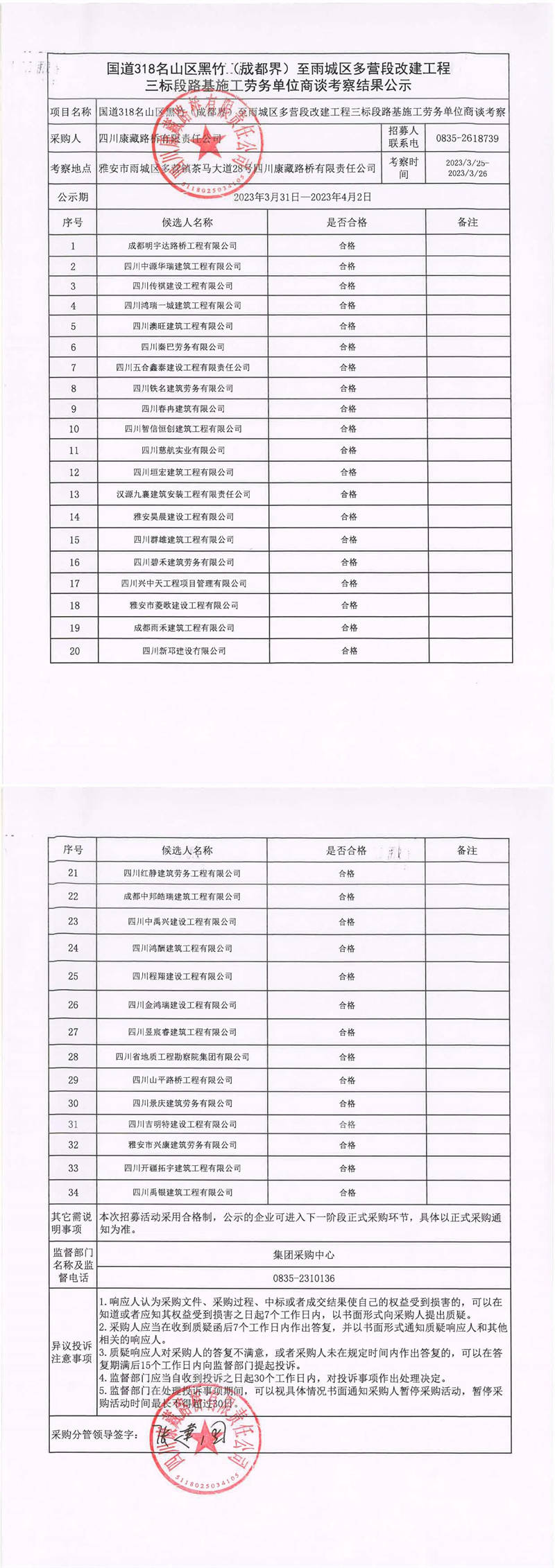 四川康藏路橋有限責(zé)任公司國道318名山區(qū)黑竹(成都界)至雨城區(qū)多營段改建工程三標段橋梁施工勞務(wù)單位商談考察結(jié)果公示