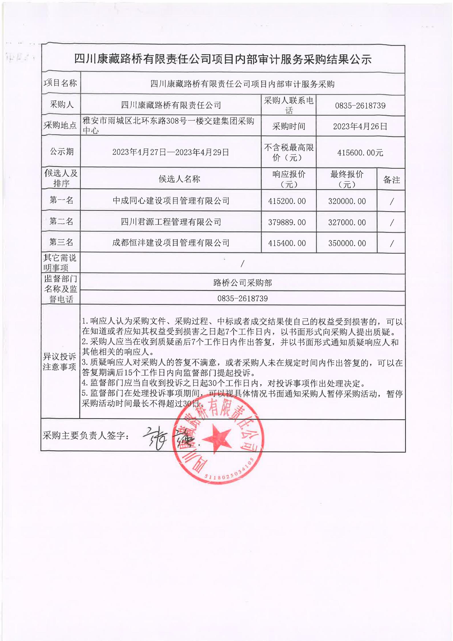 四川康藏路橋有限責(zé)任公司項目內(nèi)部審計服務(wù)采購結(jié)果公示
