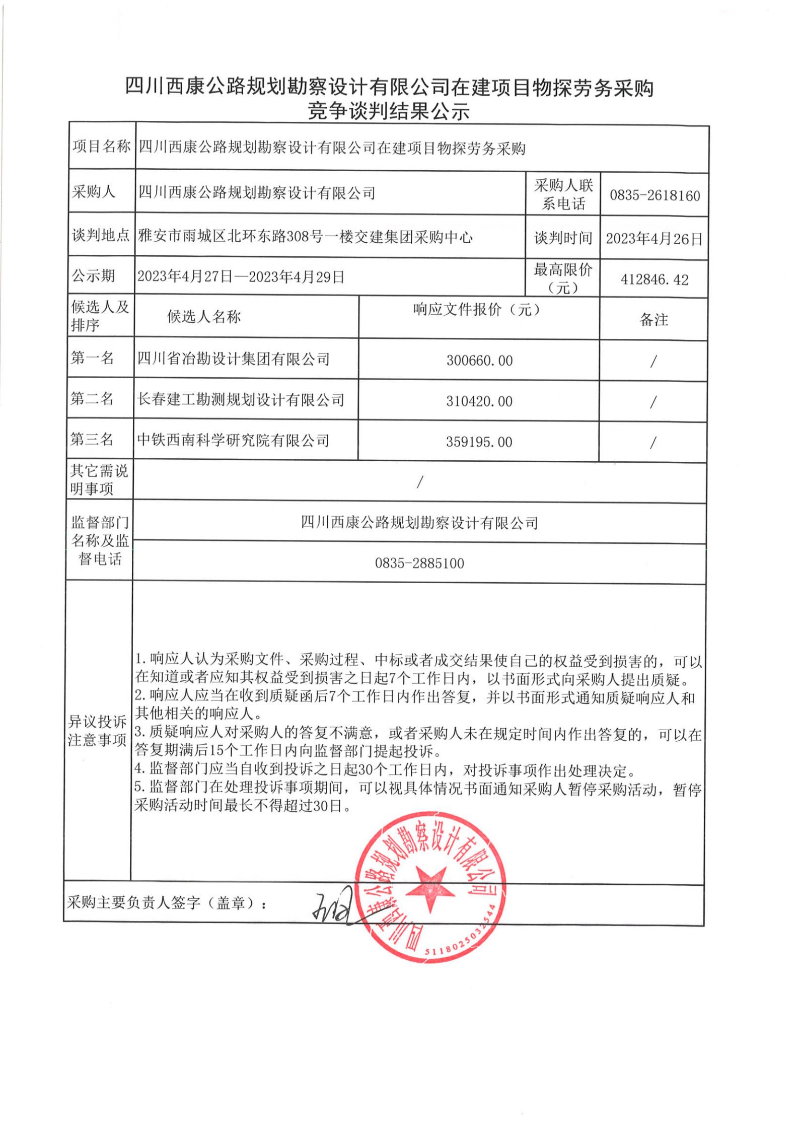 四川西康公路規(guī)劃勘察設(shè)計有限公司在建項目物探勞務(wù)采購競爭談判結(jié)果公示