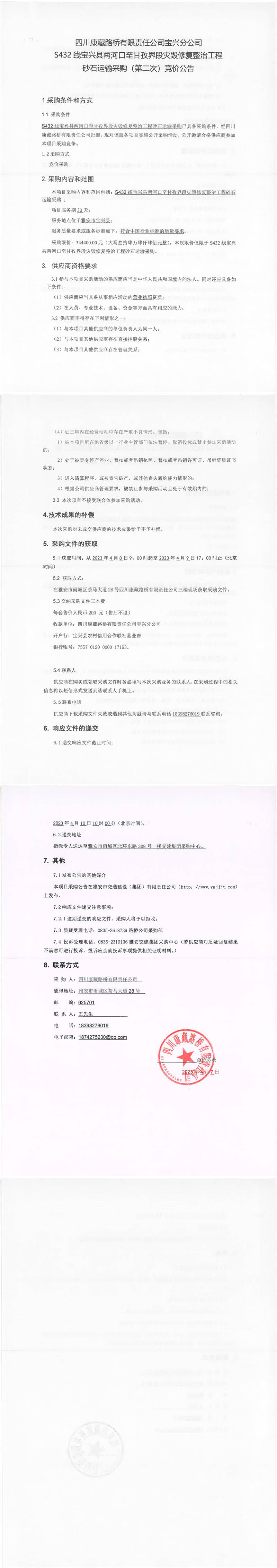 四川康藏路橋有限責任公司寶興分公司S432寶興縣兩河口至甘孜界段災毀修復整治工程砂石運輸采購(第二次)競價公告
