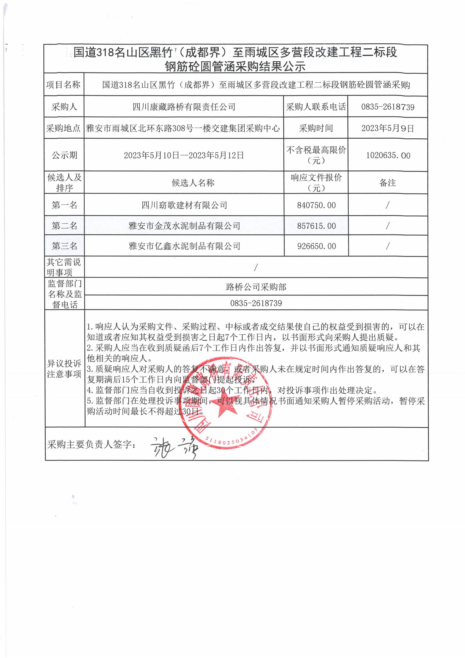 四川康藏路橋有限責任公司國道318名山區(qū)黑竹(成都界)至雨城區(qū)多營段改建工程二標段鋼筋砼圓管涵采購結(jié)果公示
