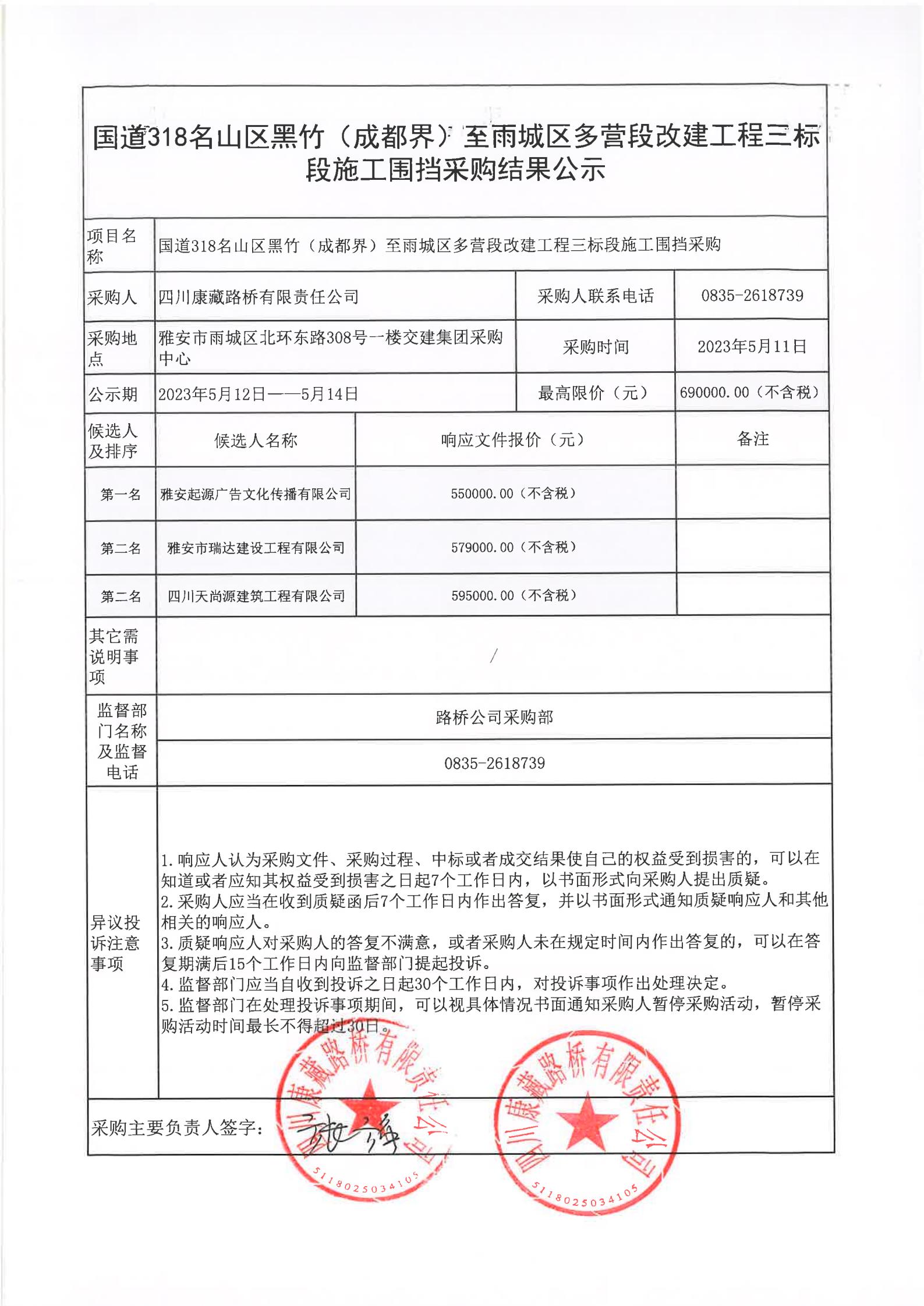 四川康藏路橋有限責任公司國道318名山區(qū)黑竹(成都界)至雨城區(qū)多營段改建工程三標段施工圍擋采購結果公示