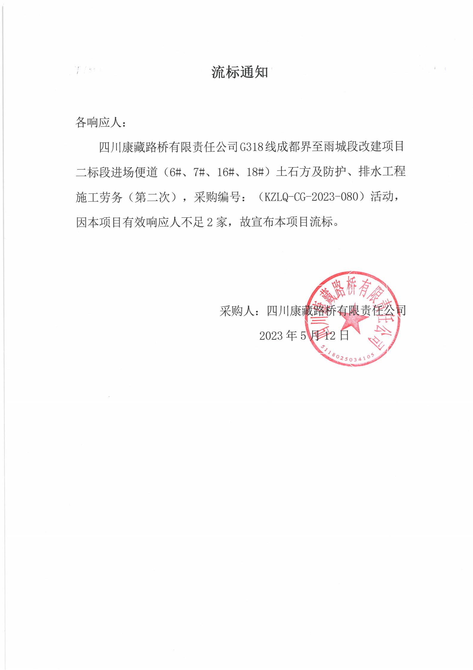 四川康藏路橋有限責(zé)任公司G318線成都至雨城段改建項目二標段進場便道(6#、7#、16#、18#)土石方及防護、排水工程施工勞務(wù)(第二次)流標通知