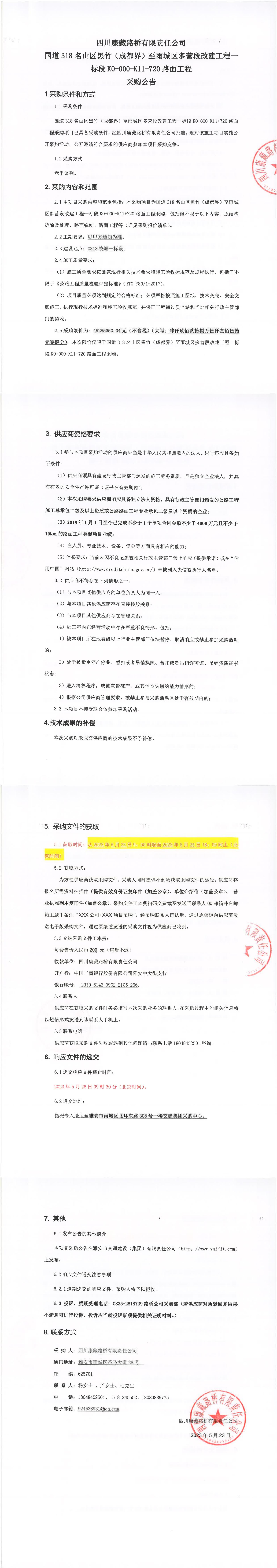 四川康藏路橋有限責(zé)任公司國(guó)道318名山區(qū)黑竹(成都界)至雨城區(qū)多營(yíng)段改建工程一標(biāo)段K0+000-K11+720路面工程采購(gòu)公告
