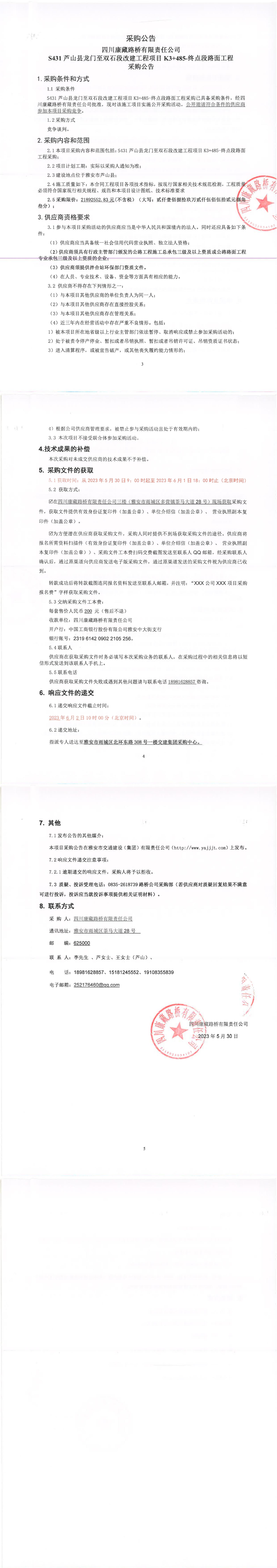 四川康藏路橋有限責任公司S431蘆山縣龍門至雙石段改建工程項目K3+485-終點段路面工程采購公告