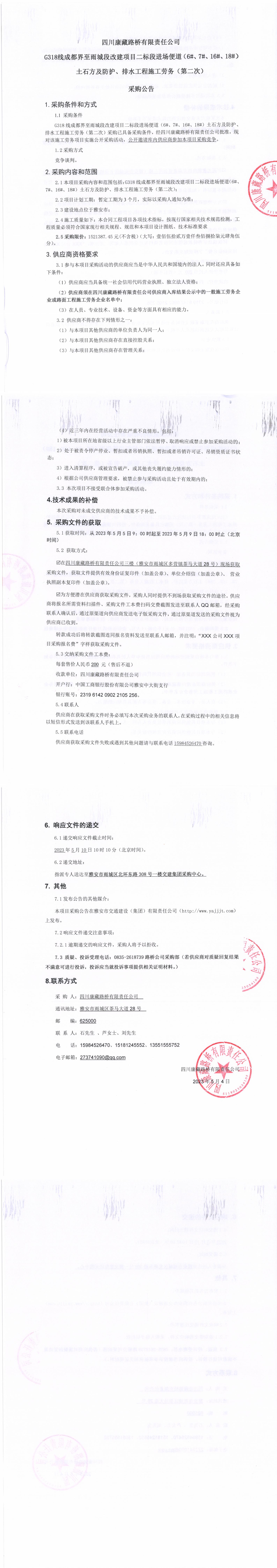 四川康藏路橋有限責(zé)任公司G318線成都至雨城段改建項目二標(biāo)段進(jìn)場便道(6#、7#、16#、18#)土石方及防護、排水工程施工勞務(wù)(第二次)采購公告