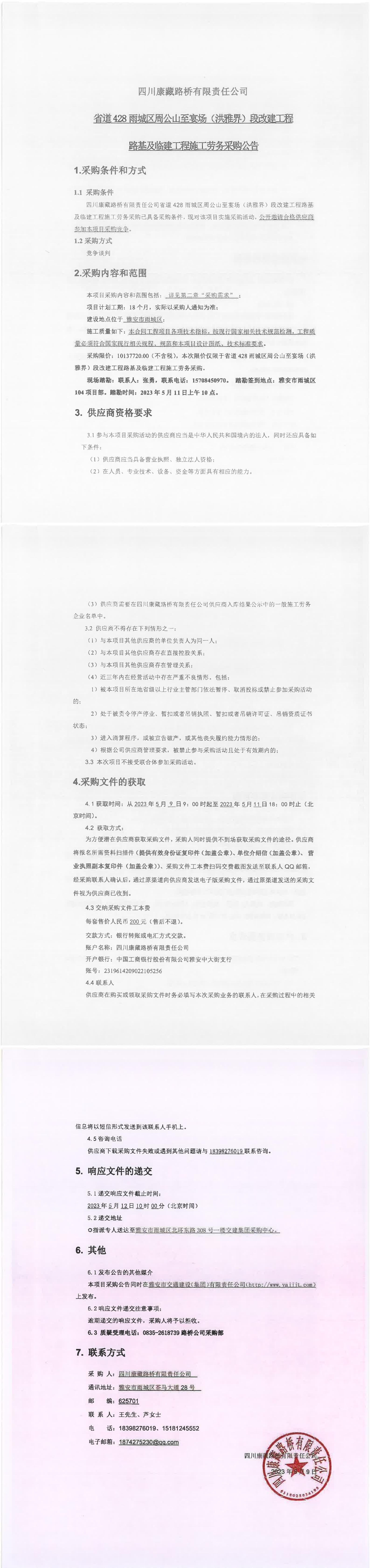 四川康藏路橋有限責(zé)任公司省道428雨城區(qū)周公山至宴場(chǎng)(洪雅界)段改建工程路基及臨建工程施工勞務(wù)采購(gòu)公告