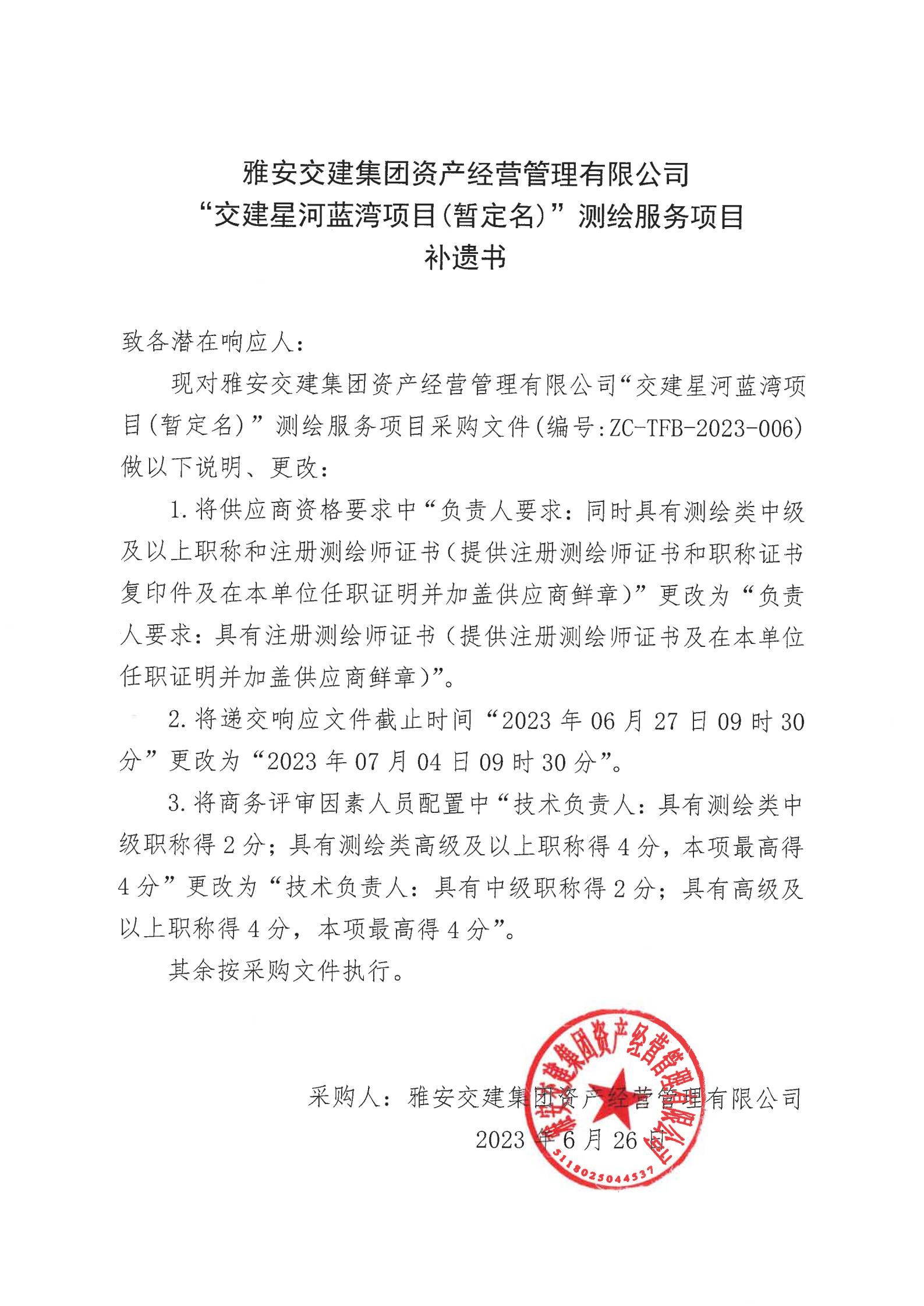 雅安交建集團(tuán)資產(chǎn)經(jīng)營管理有限公司“交建星河藍(lán)灣項目(暫定名)”測繪服務(wù)項目補(bǔ)遺書