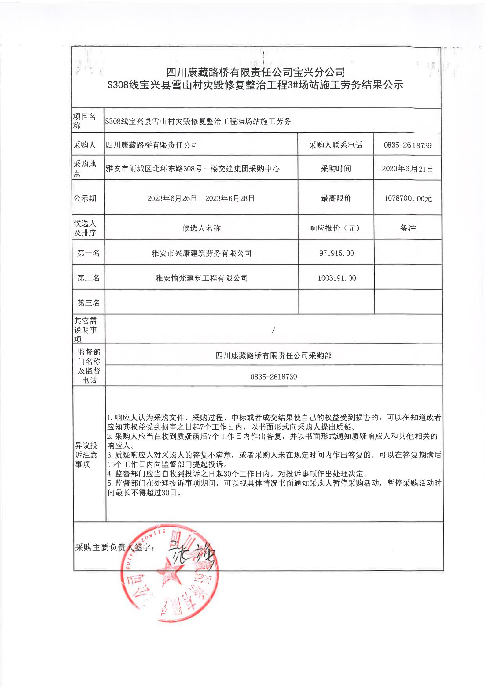 四川康藏路橋有限責(zé)任公司寶興分公司S308線寶興縣雪山村段災(zāi)毀修復(fù)整治工程4#場站施工勞務(wù)結(jié)果公示