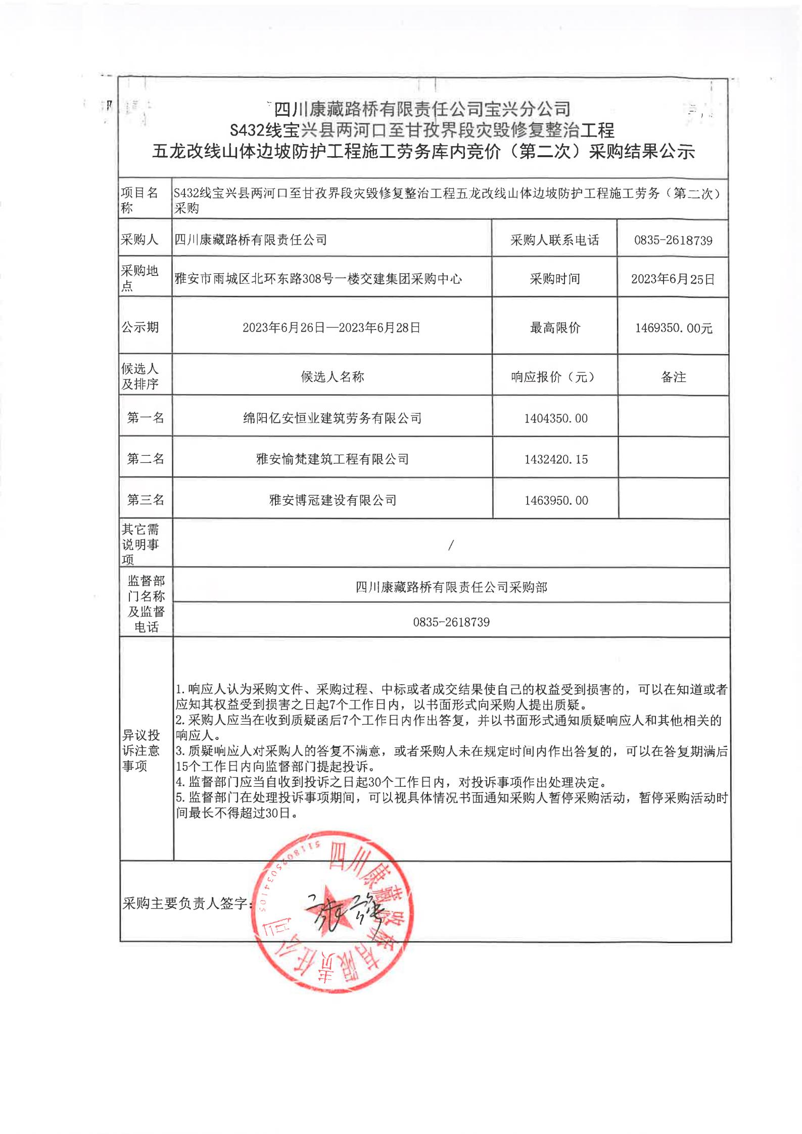四川康藏路橋有限責(zé)任公司寶興分公司S432寶興縣兩河口至甘孜界段災(zāi)毀修復(fù)整治工程五龍改線山體邊坡防護(hù)工程施工勞務(wù)庫內(nèi)競價(jià)(第二次)結(jié)果公示