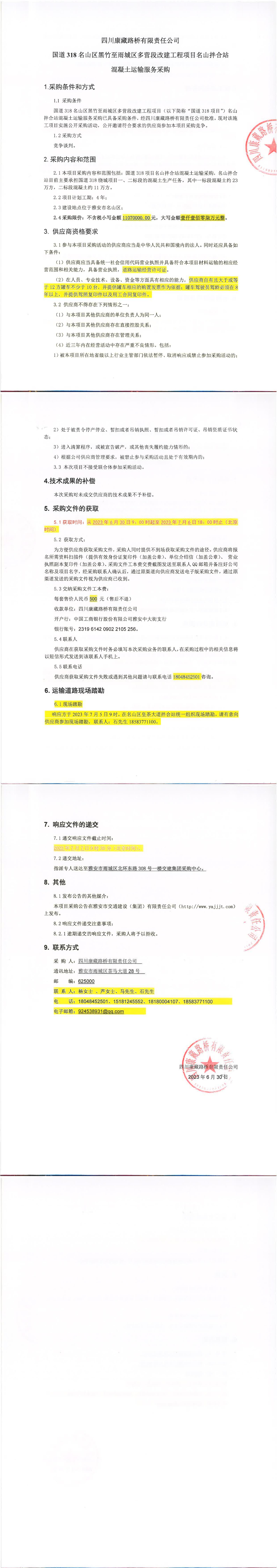 四川康藏路橋有限責(zé)任公司國道318名山區(qū)黑竹至雨城區(qū)多營段改建工程項目名山拌合站混凝土運(yùn)輸服務(wù)采購