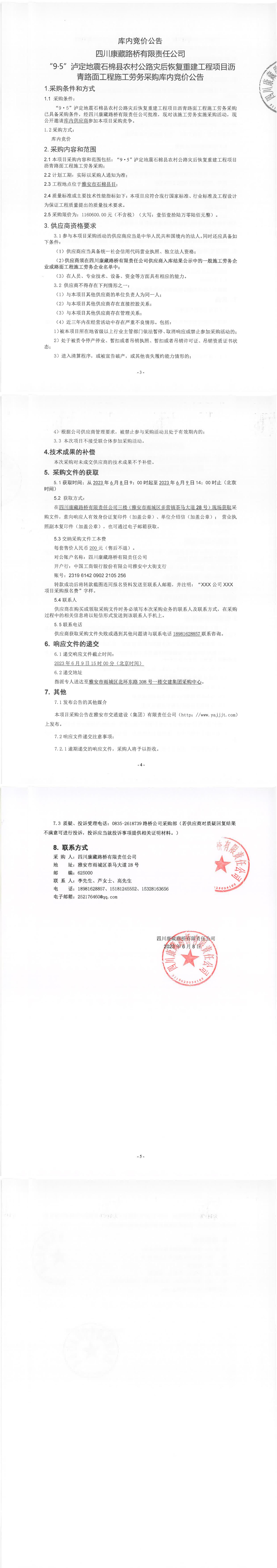 四川康藏路橋有限責(zé)任公司“9·5”瀘定地震石棉縣農(nóng)村公路災(zāi)后恢復(fù)重建工程項(xiàng)目瀝青路面工程施工勞務(wù)采購(gòu)庫(kù)內(nèi)競(jìng)價(jià)公告