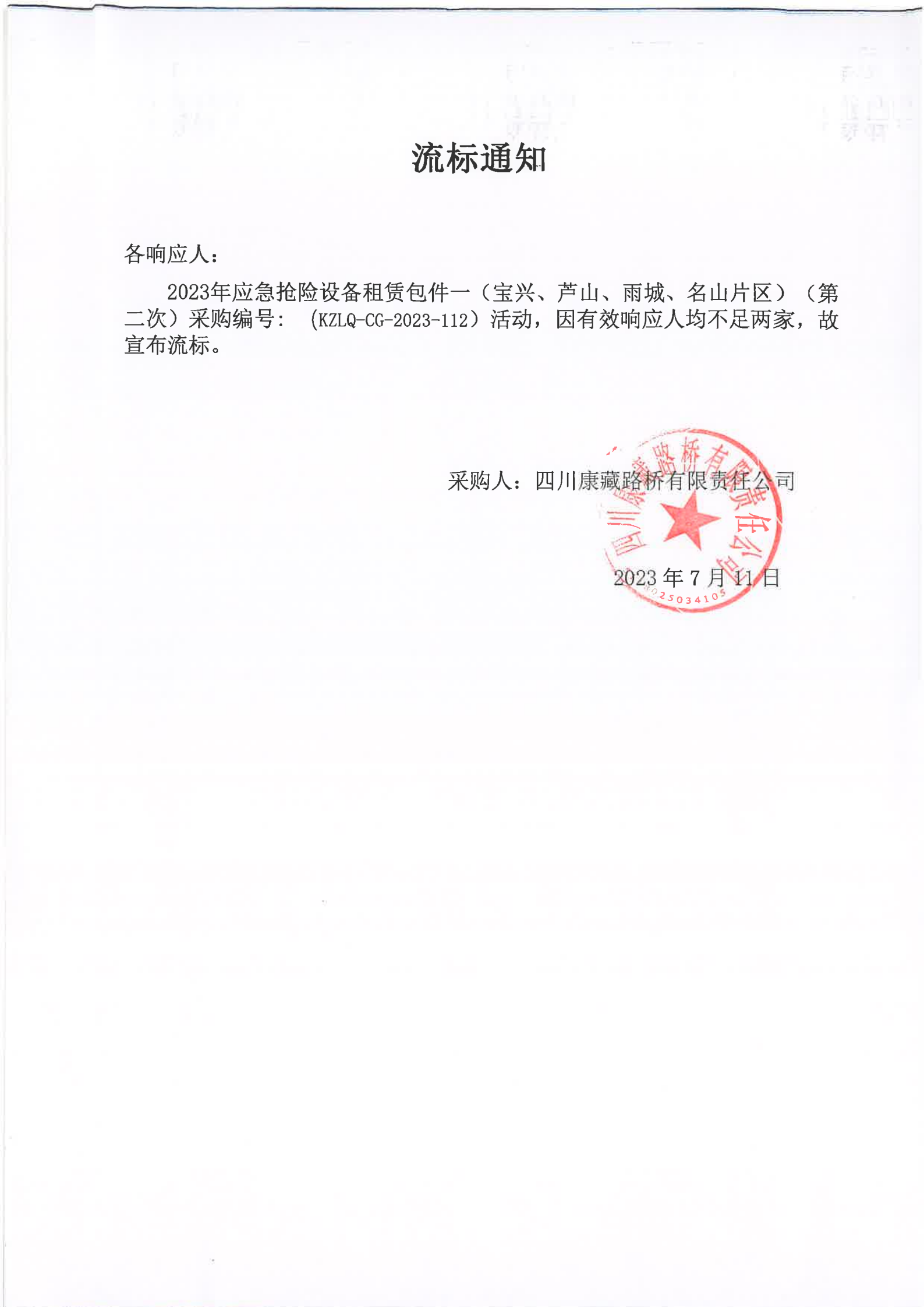 四川康藏路橋有限責(zé)任公司2023年應(yīng)急搶險(xiǎn)設(shè)備租賃包件一(寶興、蘆山、雨城、名山片區(qū))(第二次)流標(biāo)通知