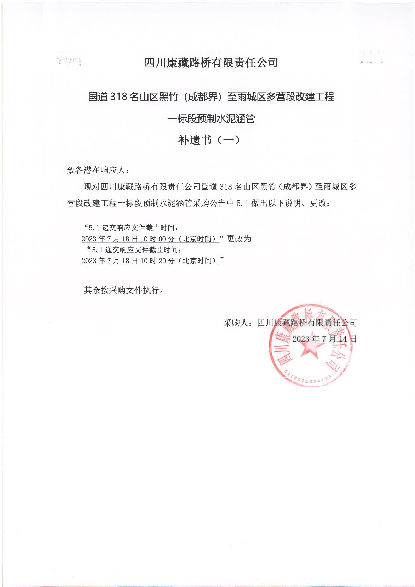 四川康藏路橋有限責(zé)任公司國道318名山區(qū)黑竹(成都界)至雨城區(qū)多營段改建工程一標段預(yù)制水泥涵管(補遺書)(一)