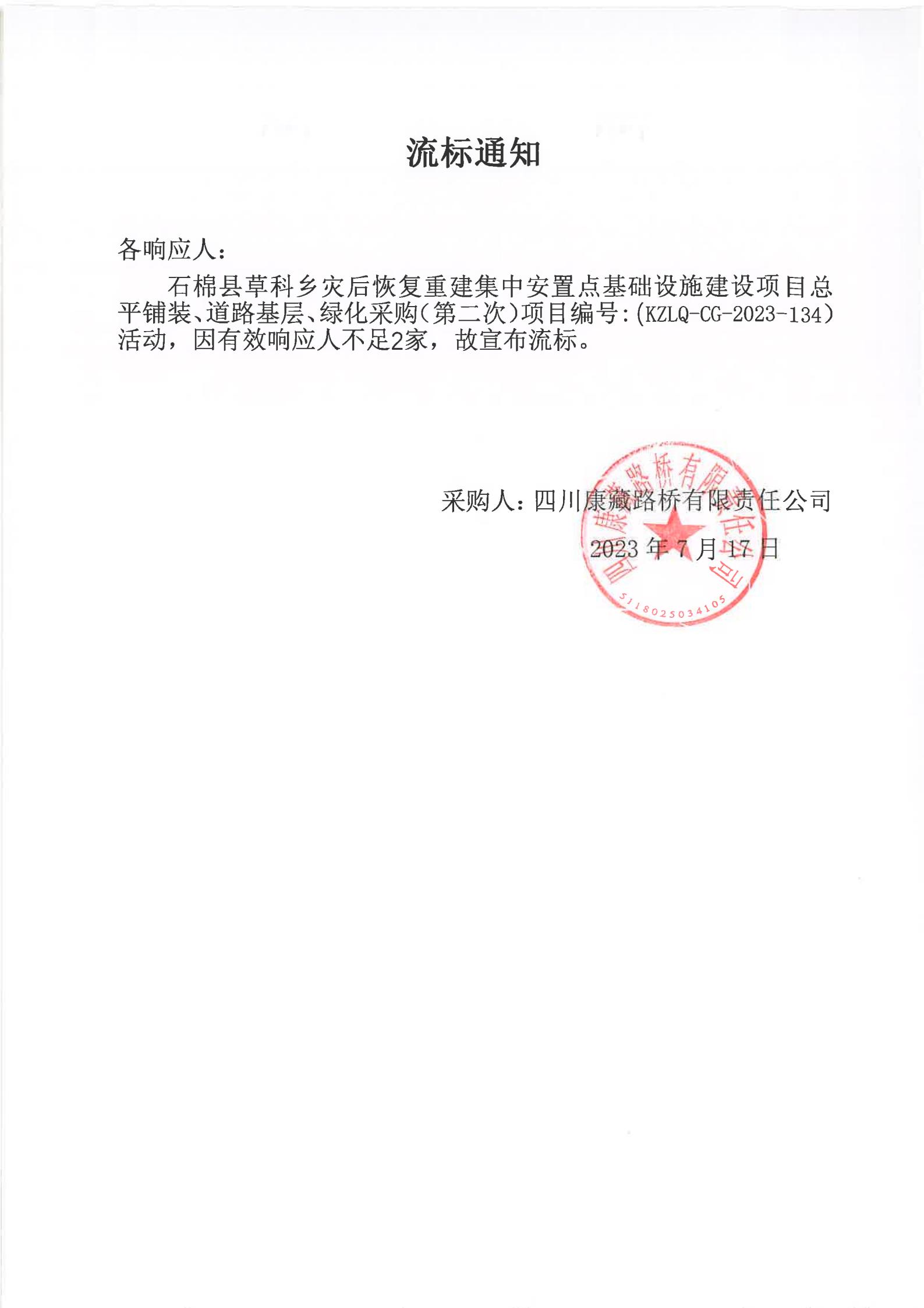 四川康藏路橋有限責(zé)任公司石棉縣草科鄉(xiāng)災(zāi)后恢復(fù)重建集中安置點(diǎn)基礎(chǔ)設(shè)施建設(shè)項(xiàng)目總平鋪裝、道路基層、綠化采購(gòu)(第二次)流標(biāo)通知