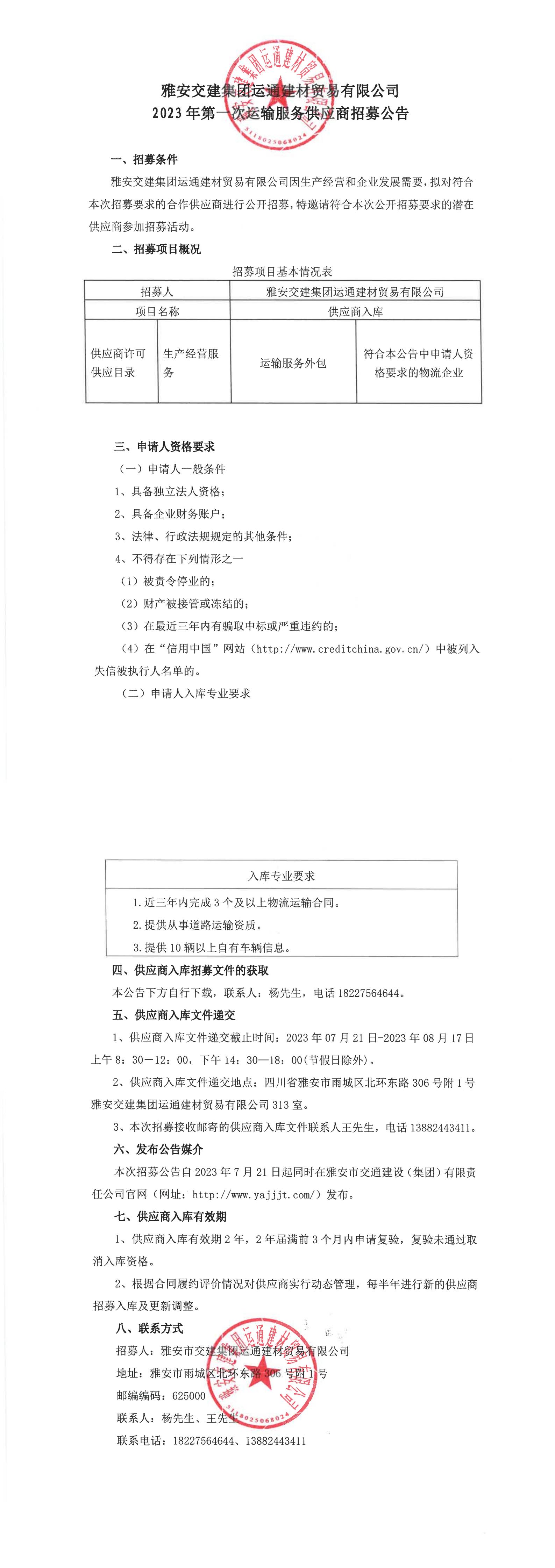 雅安交建集團(tuán)運通建材貿(mào)易有限公司2023年第一次運輸服務(wù)供應(yīng)商招募公告