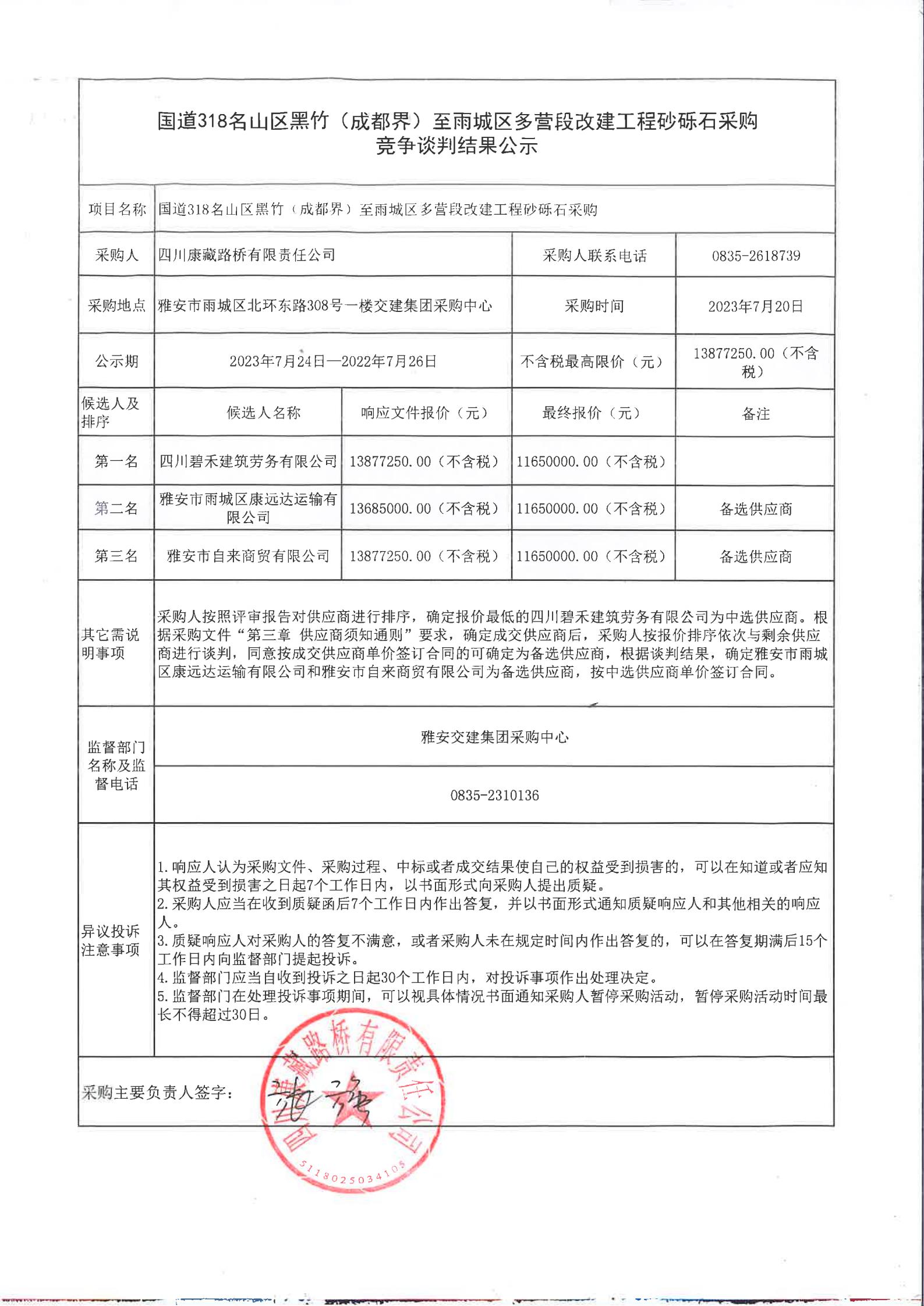 四川康藏路橋有限責(zé)任公司國(guó)道318名山區(qū)黑竹(成都界)至雨城區(qū)多營(yíng)段改建工程砂礫石采購(gòu)競(jìng)爭(zhēng)談判結(jié)果公示