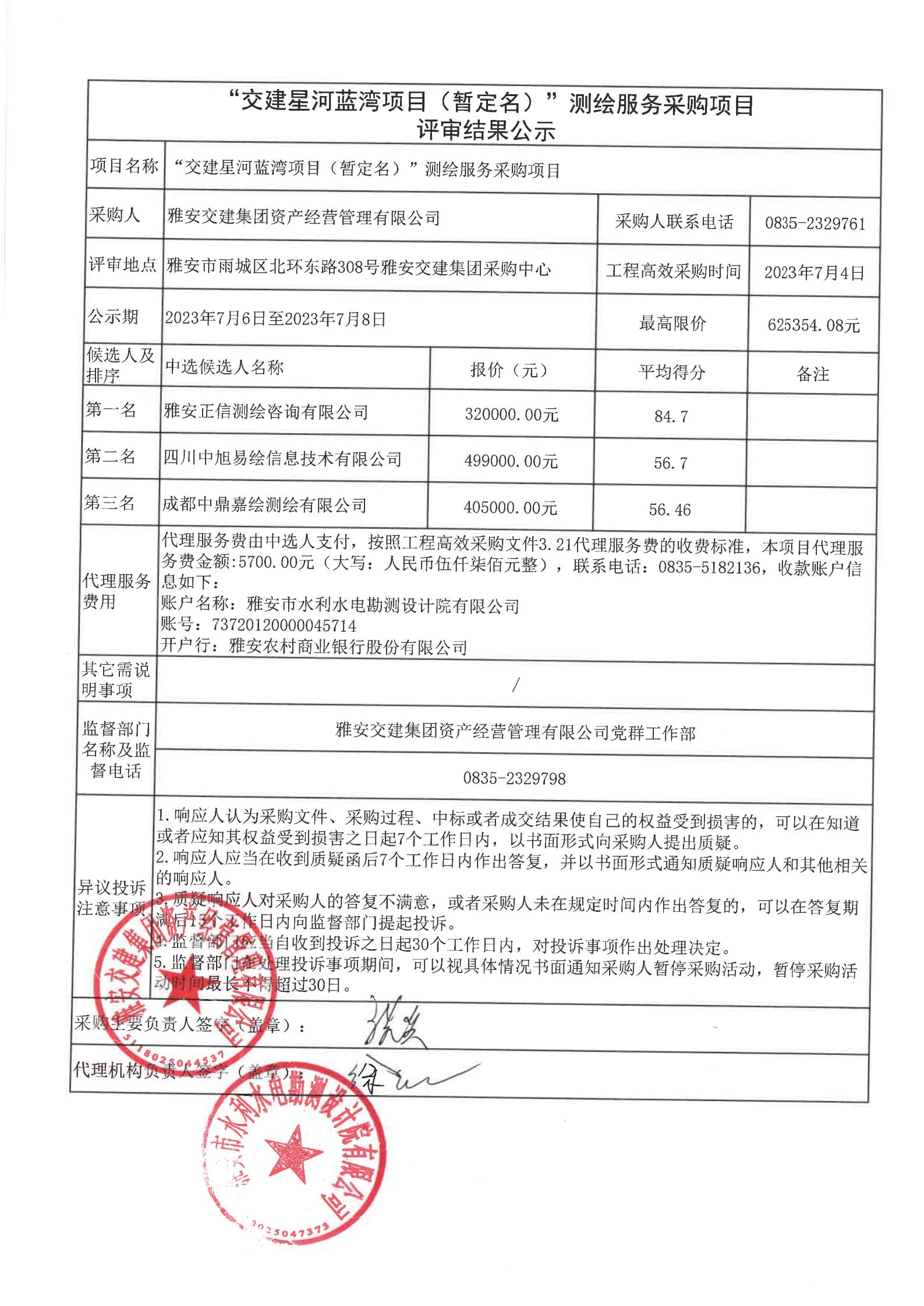 雅安交建集團資產(chǎn)經(jīng)營管理有限公司“交建星河藍灣項目(暫定名)”測繪服務(wù)采購項目評審結(jié)果公示
