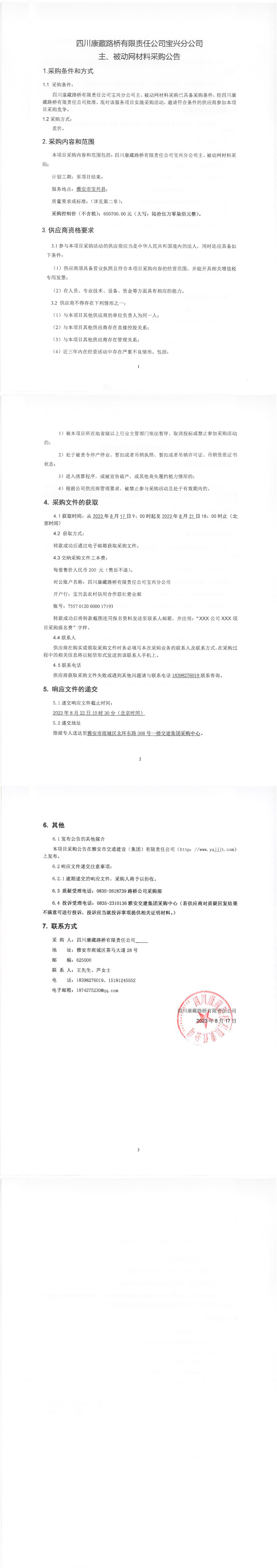 四川康藏路橋有限責(zé)任公司寶興分公司主、被動(dòng)網(wǎng)材料采購公告