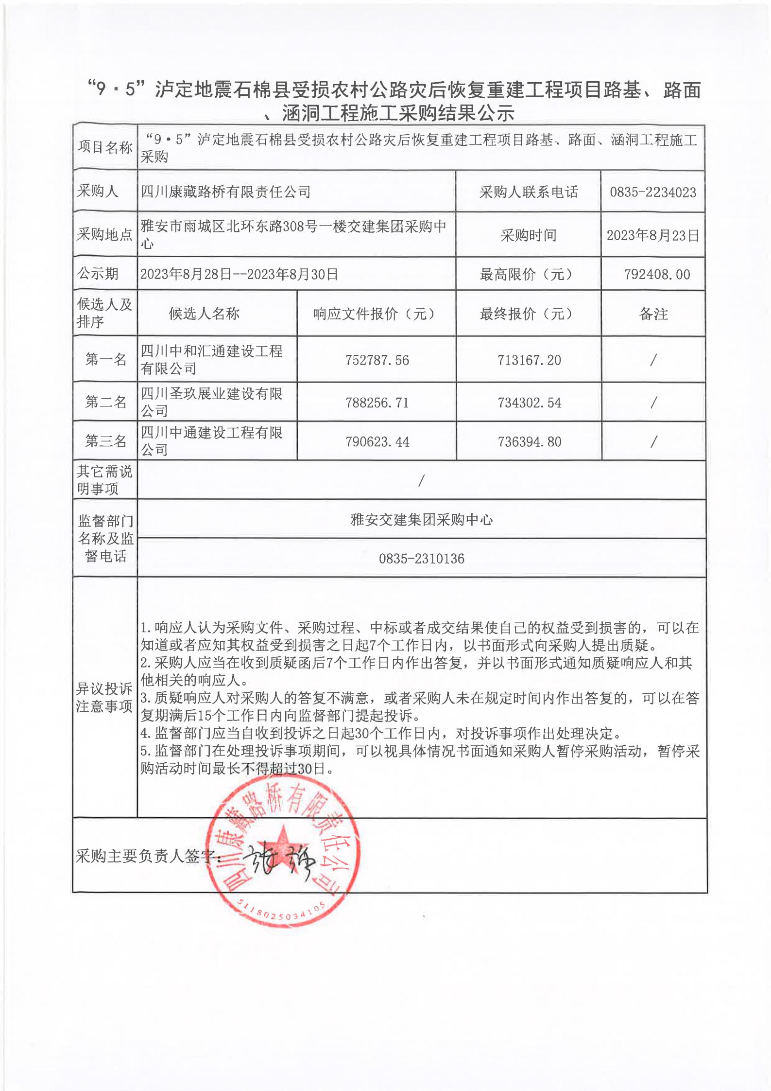 四川康藏路橋有限責任公司“9·5”瀘定地震石棉縣受損農(nóng)村公路災(zāi)后恢復重建工程項目路基、路面、涵洞工程施工采購結(jié)果公示