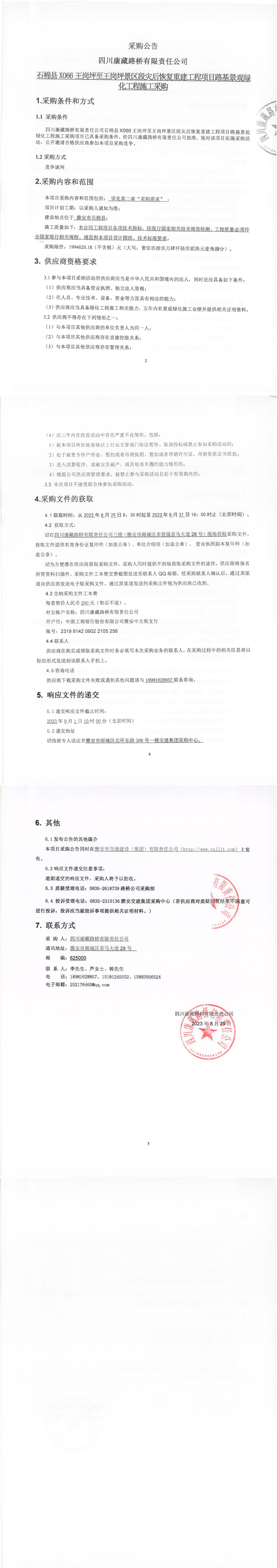 四川康藏路橋有限責(zé)任公司石棉縣X066王崗坪至王崗坪景區(qū)段災(zāi)后恢復(fù)重建工程項目路基景觀綠化工程施工采購公告