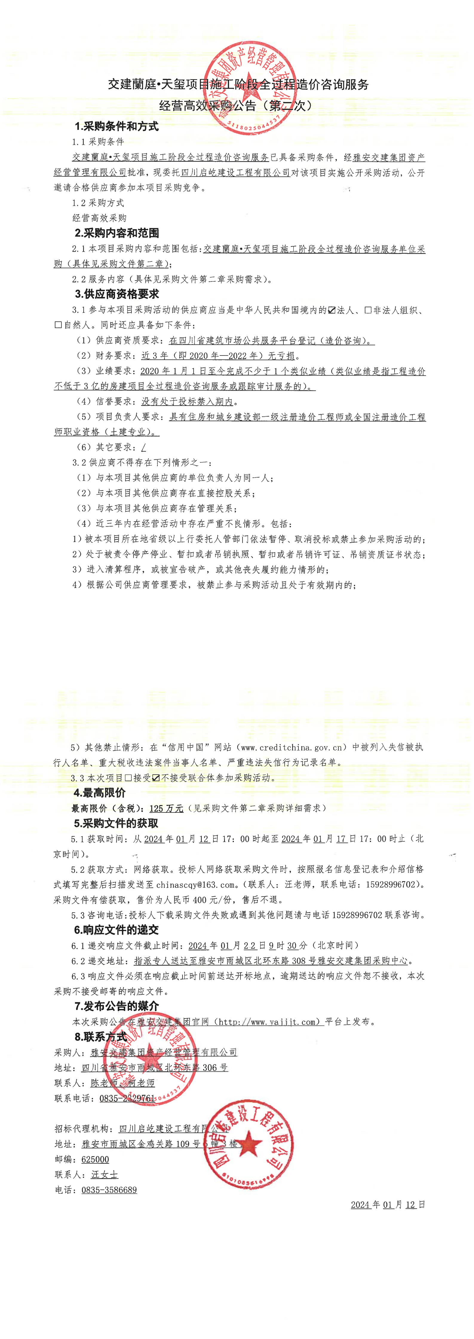 雅安交建集團(tuán)資產(chǎn)經(jīng)營(yíng)管理有限公司交建蘭庭·天璽項(xiàng)目施工階段全過(guò)程造價(jià)咨詢服務(wù)經(jīng)營(yíng)高效采購(gòu)公告(第二次)