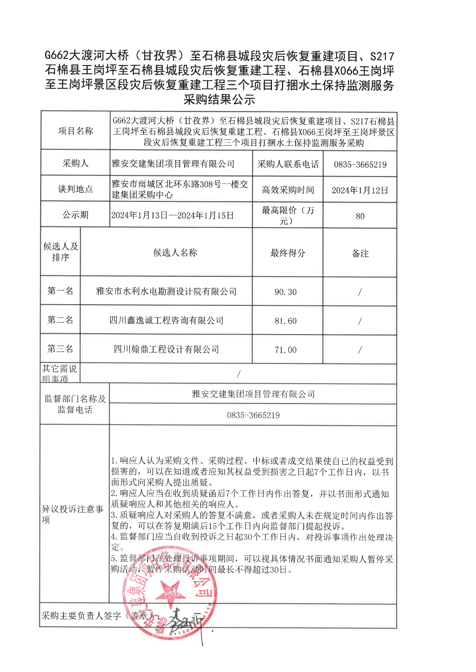 雅安交建集團項目管理有限公司G662大渡河大橋(甘孜界)至石棉縣城段災后恢復重建項目、S217石棉縣王崗坪至石棉縣城段災后恢復重建工程、石棉縣X066王崗坪至王崗坪景區(qū)段災后恢復重建工程三個項目打捆水土保持監(jiān)測服務采購結果公示