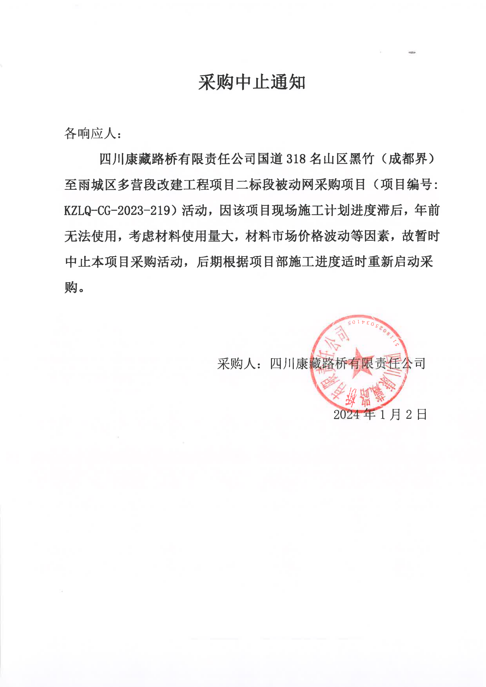 四川康藏路橋有限責任公司國道318名山區(qū)黑竹(成都界)至雨城區(qū)多營段改建工程項目二標段被動網(wǎng)采購項目采購中止通知
