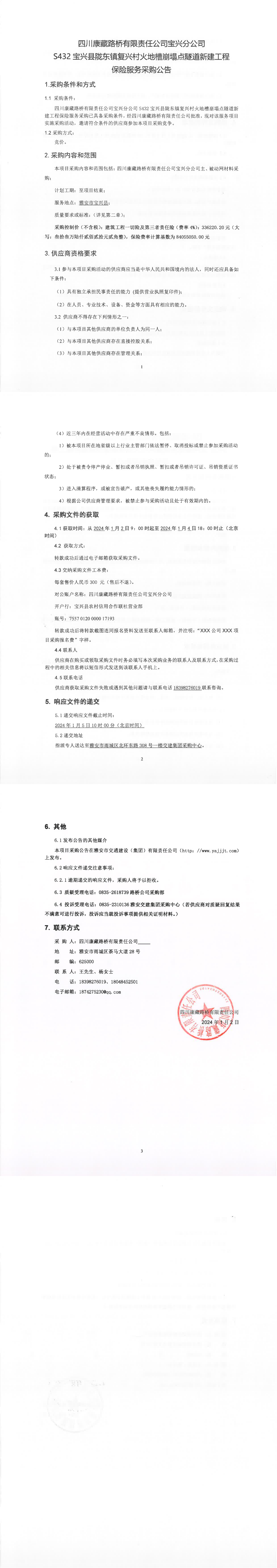 四川康藏路橋有限責(zé)任公司寶興分公司S432寶興縣隴東鎮(zhèn)復(fù)興村火地槽崩塌點(diǎn)隧道新建工程保險(xiǎn)服務(wù)采購公告