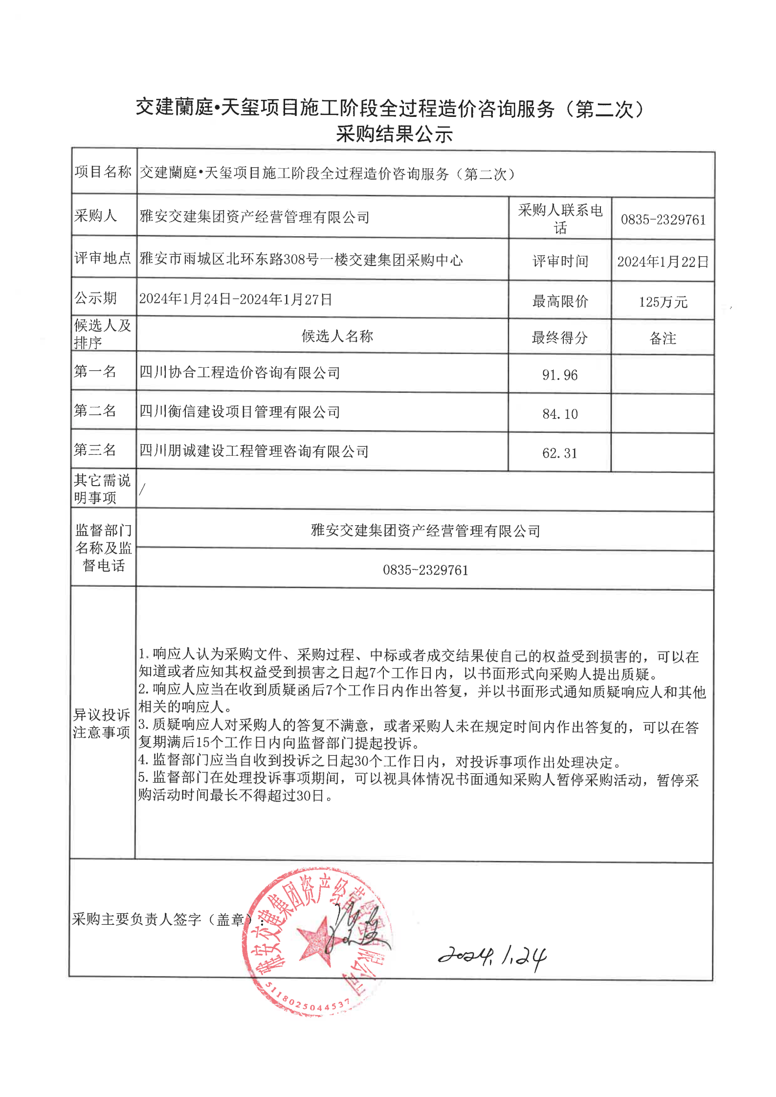 雅安交建集團(tuán)資產(chǎn)經(jīng)營管理有限公司交建蘭庭·天璽項目施工階段全過程造價咨詢服務(wù)(第二次)采購結(jié)果公示