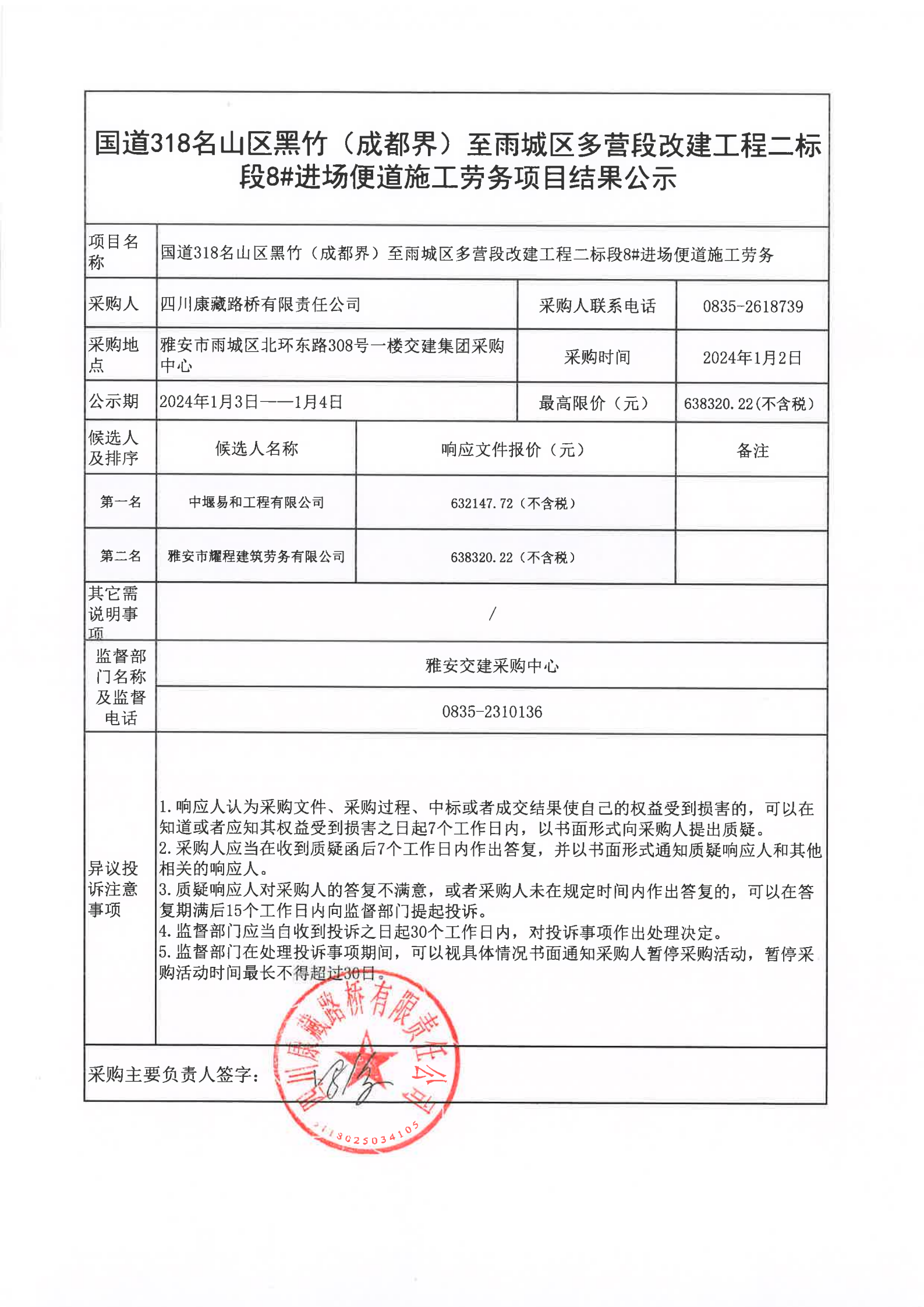 四川康藏路橋有限責任公司國道318名山區(qū)黑竹(成都界)至雨城區(qū)多營段改建工程二標段8#進場便道施工勞務項目結果公示