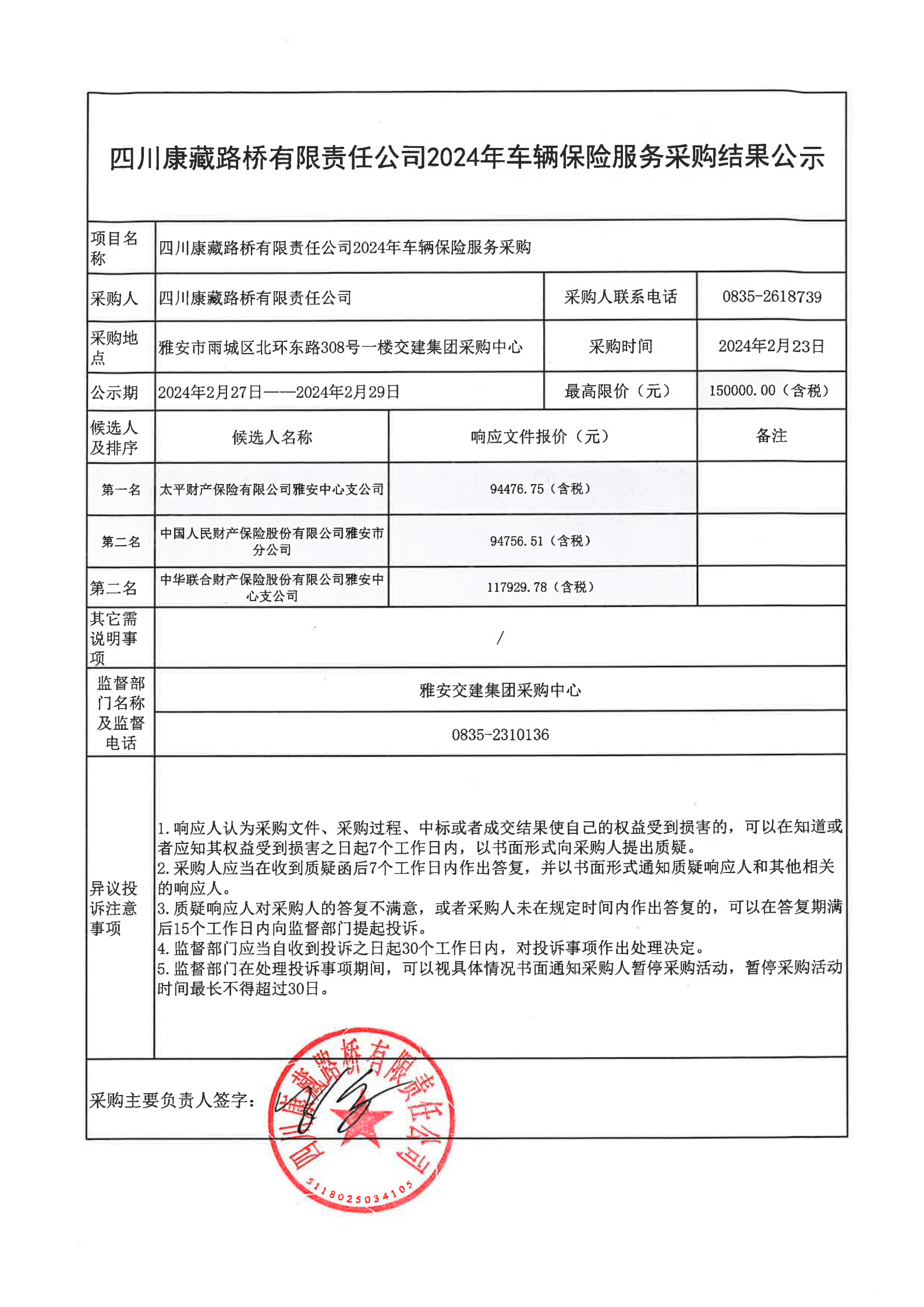 四川康藏路橋有限責(zé)任公司2024年車(chē)輛保險(xiǎn)服務(wù)采購(gòu)結(jié)果公示