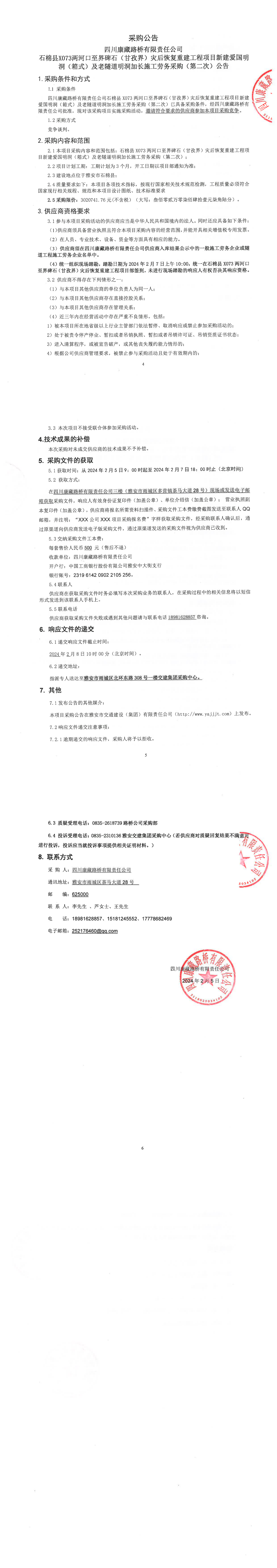 四川康藏路橋有限責任公司國道318名山區(qū)黑竹(成都界)至雨城區(qū)多營段改建工程二標段安全物資(五金類)采購(第二次)結(jié)果公示