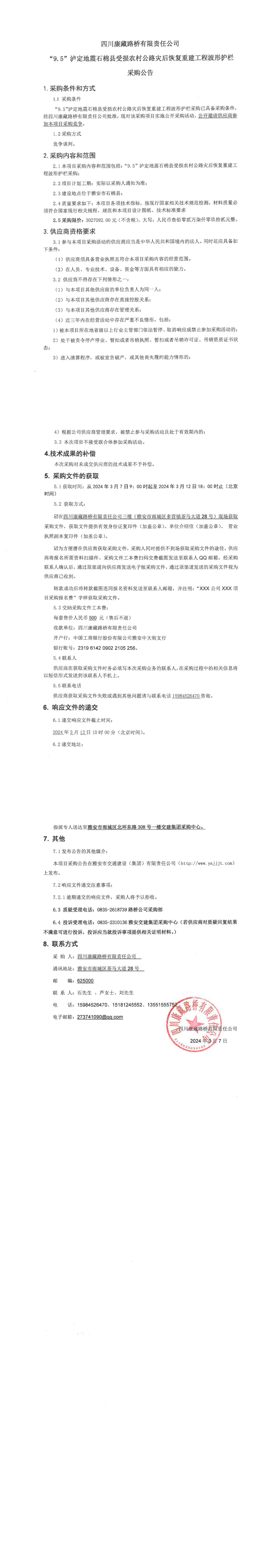 四川康藏路橋有限責(zé)任公司“9.5”瀘定地震石棉縣受損農(nóng)村公路災(zāi)后恢復(fù)重建工程波形護(hù)欄采購(gòu)公告