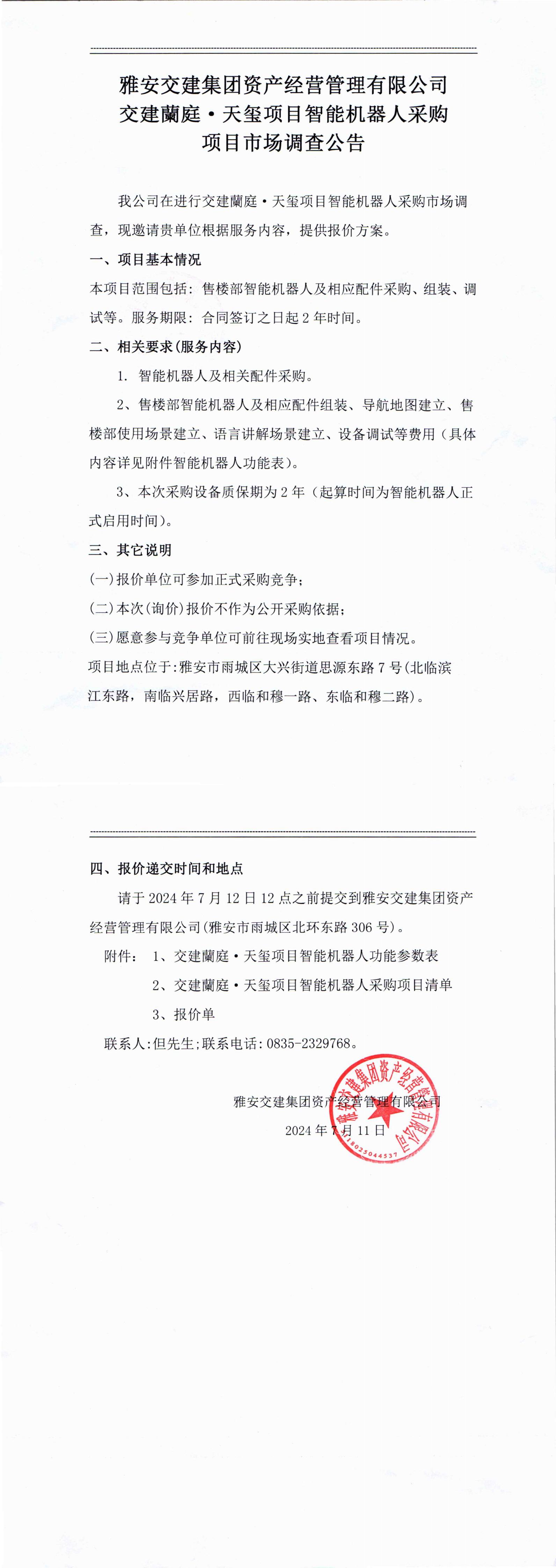 雅安交集團(tuán)資產(chǎn)經(jīng)營(yíng)管理有限公司交建蘭庭·天璽項(xiàng)目智能機(jī)器人采購(gòu)項(xiàng)目市場(chǎng)調(diào)查公告
