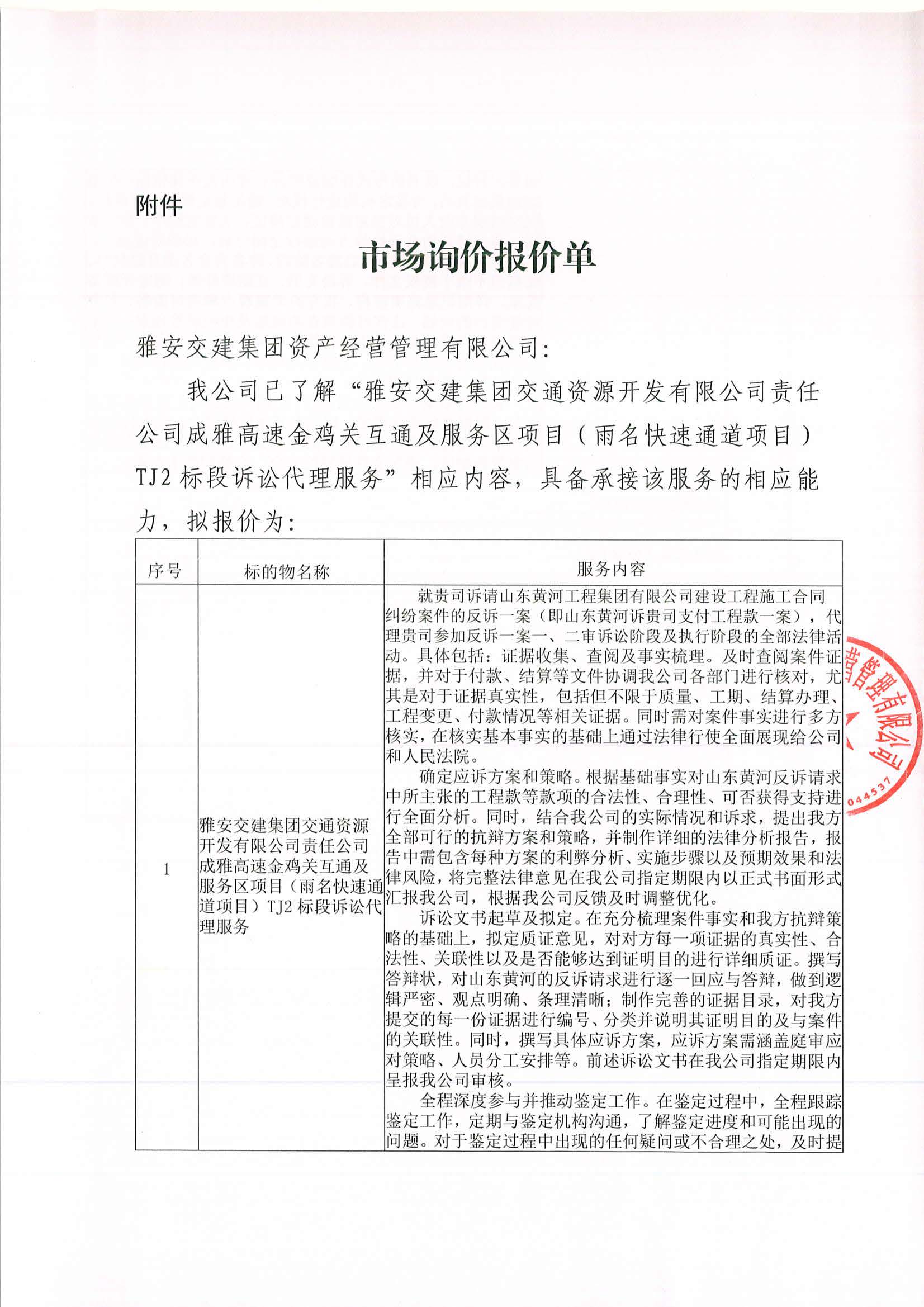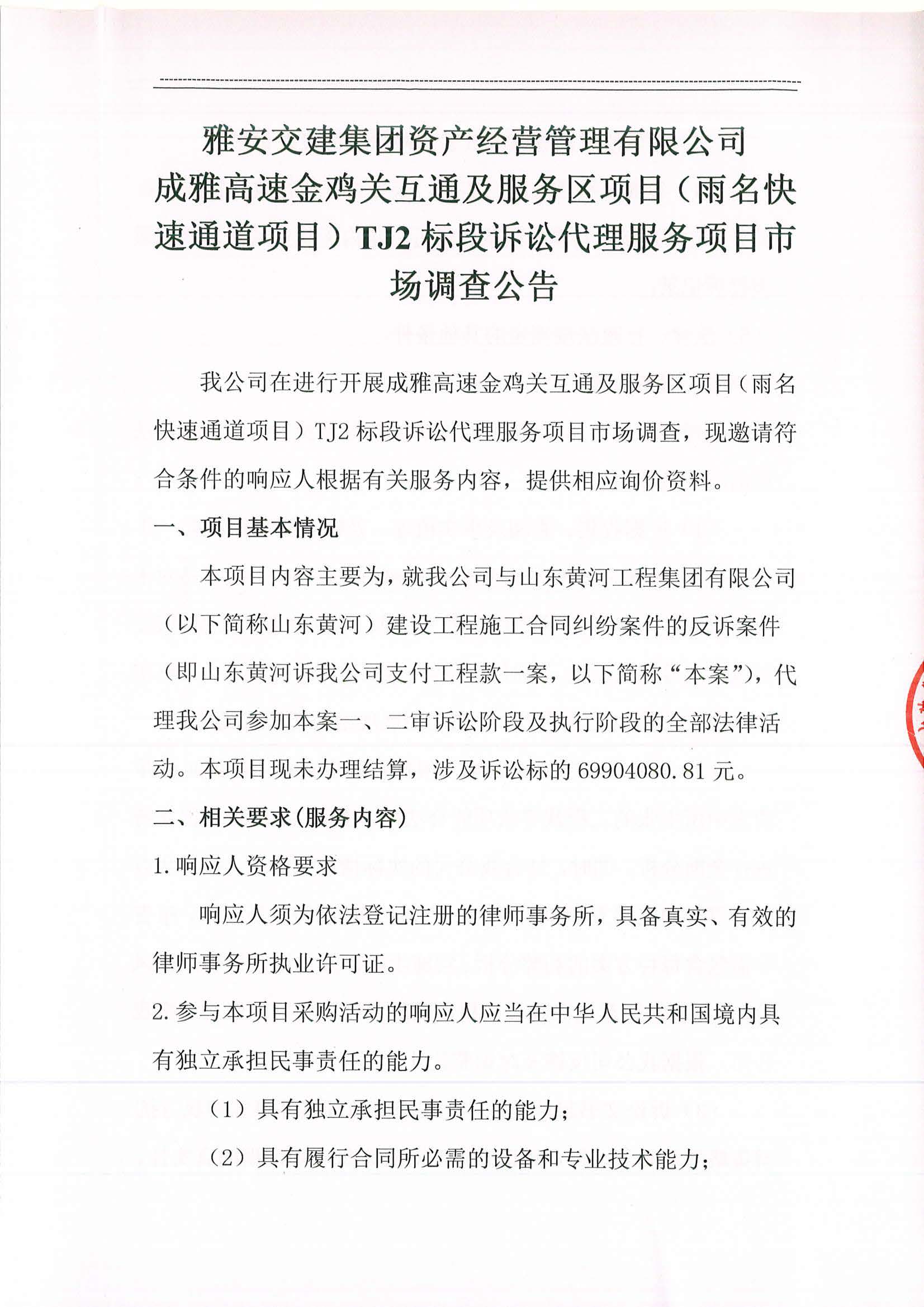 雅安交建集團資產經營管理有限公司成雅高速金雞關互通及服務區(qū)項目(雨名快速通道項目)TJ2標段訴訟代理服務項目市場調查公告