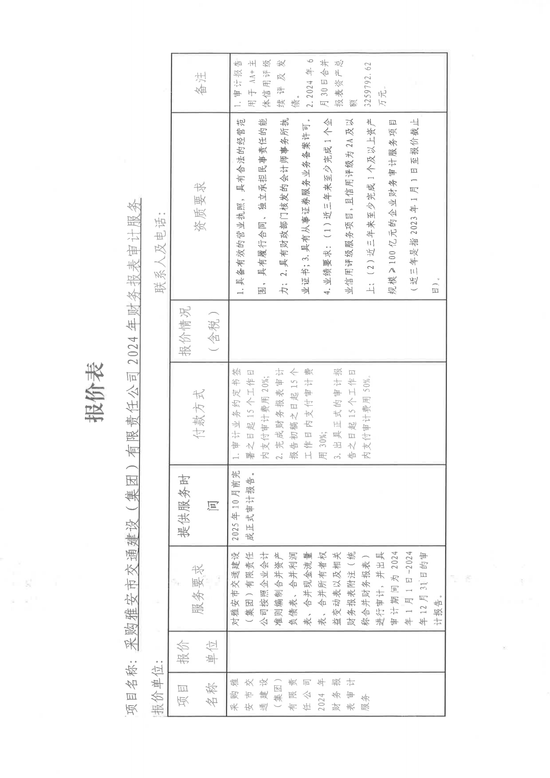 關(guān)于采購(gòu)雅安市交通建設(shè)(集團(tuán))有限責(zé)任公司主體信用評(píng)級(jí)2024年財(cái)務(wù)報(bào)表審計(jì)服務(wù)單位的詢價(jià)函