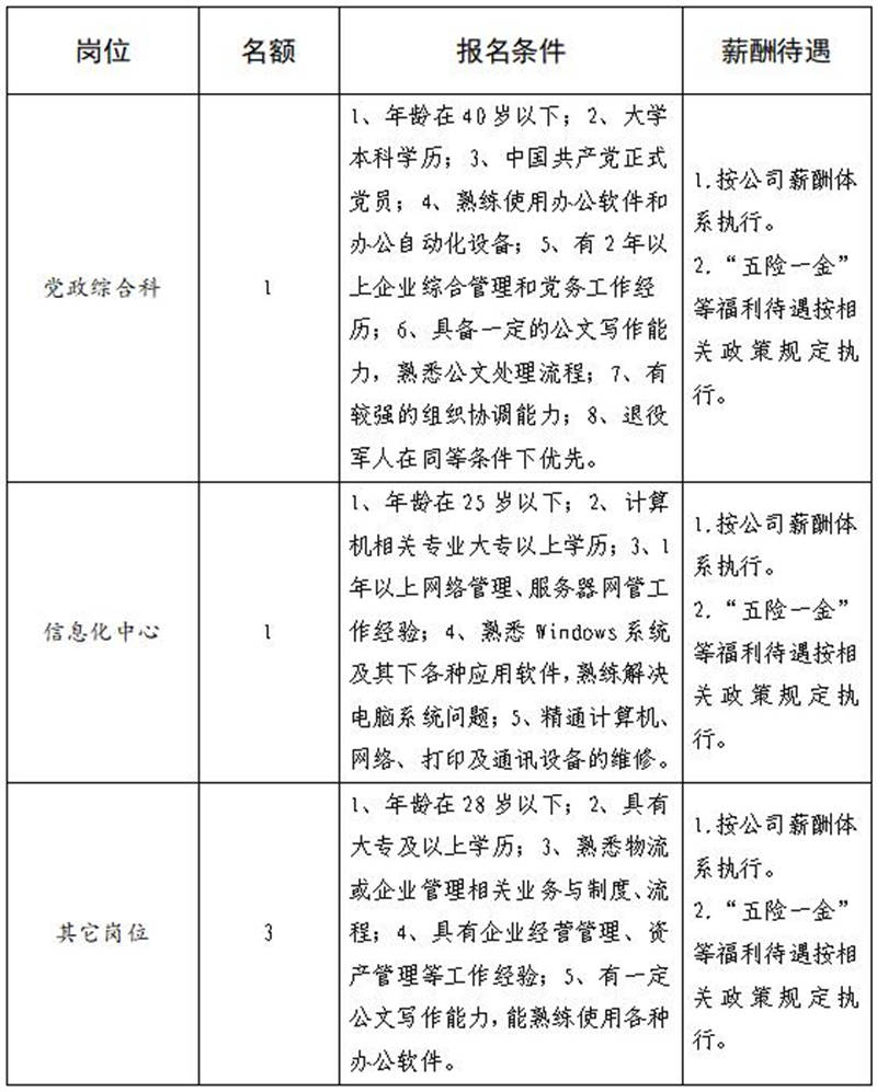 雅安交建集團(tuán)無水港物流有限責(zé)任公司主要從事雅安市快遞物流分撥、集裝箱掏拼箱作業(yè)、倉(cāng)儲(chǔ)等業(yè)務(wù)。現(xiàn)根據(jù)公司業(yè)務(wù)發(fā)展需要,雨城分公司擬招聘5名工作人員,現(xiàn)將有關(guān)事項(xiàng)公告如下: