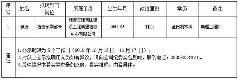 雅安交建集團子公司擬聘用人員公示(工程質量檢測中心)