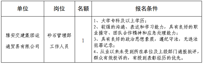 根據(jù)發(fā)展需要,決定面向社會公開招聘雅安市交通建設(集團)有限責任公司(以下簡稱“雅安交建集團”)所屬子公司工作人員1名,現(xiàn)將有關事項公告如下: