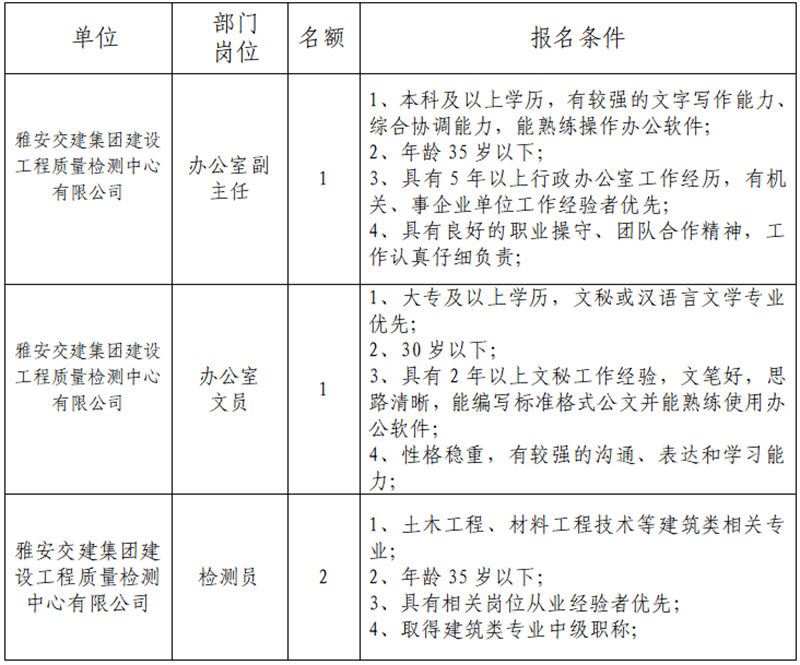 雅安交建集團(tuán)關(guān)于公開招聘所屬子公司工作人員的公告(建設(shè)工程質(zhì)量檢測(cè)中心)