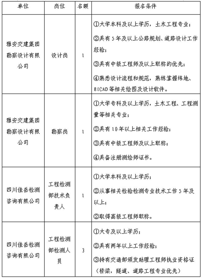 根據(jù)發(fā)展需要,決定面向社會(huì)公開招聘雅安市交通建設(shè)(集團(tuán))有限責(zé)任公司(以下簡(jiǎn)稱“雅安交建集團(tuán)”)所屬子公司工作人員6名,現(xiàn)將有關(guān)事項(xiàng)公告如下: