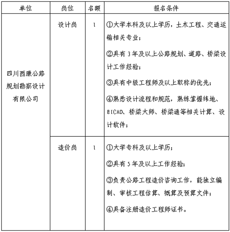 根據(jù)發(fā)展需要,決定面向社會(huì)公開招聘雅安市交通建設(shè)(集團(tuán))有限責(zé)任公司(以下簡稱“雅安交建集團(tuán)”)所屬子公司工作人員2名,現(xiàn)將有關(guān)事項(xiàng)公告如下: