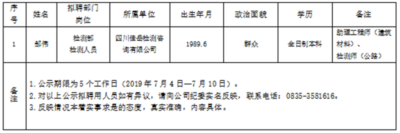 雅安交建集團(tuán)子公司擬聘用人員公示(佳岳公司)