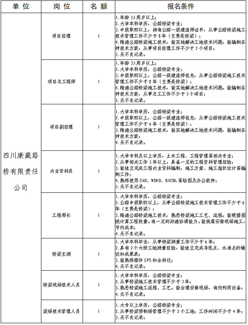 根據(jù)公司業(yè)務(wù)發(fā)展需要,決定面向社會公開招聘省道104線草壩至姚橋段改建項(xiàng)目部專業(yè)技術(shù)人才8名,現(xiàn)將有關(guān)事項(xiàng)公告如下:
