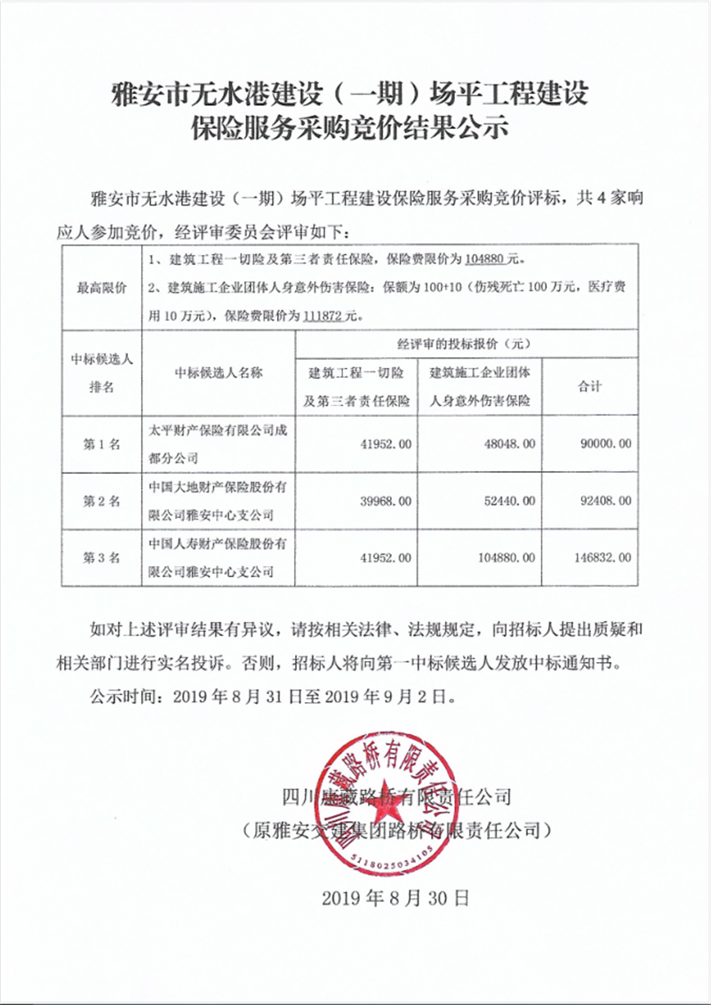 雅安市無水港建設(一期)場平工程建設保險服務采購競價結果公示