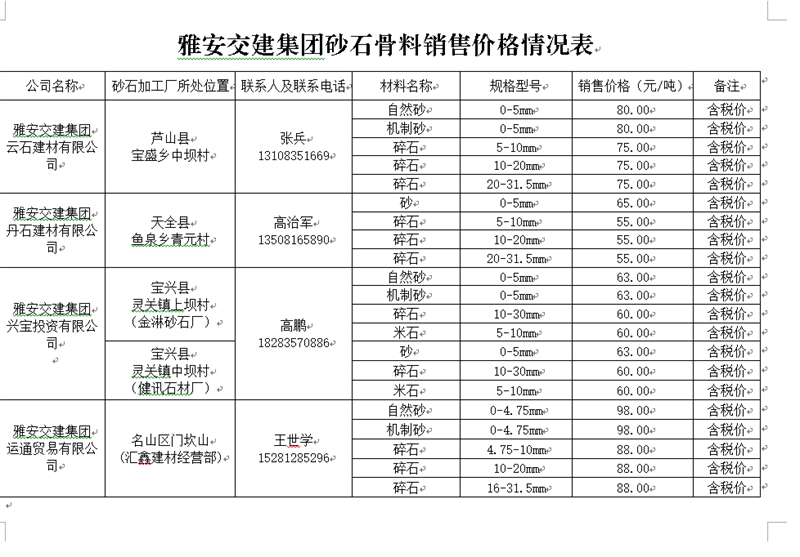 四、運通貿(mào)易有限公司。運通公司是雅安市交通建設(shè)(集團)有限責任公司獨資子公司,主要負責雨城區(qū)中心城區(qū)河道外砂石經(jīng)營管理工作。目前,公司與兩家企業(yè)確定了代加工合作關(guān)系:一是名山區(qū)匯鑫建材經(jīng)營部,該企業(yè)位于名山區(qū)門坎山,已投產(chǎn);二是雅安市名山區(qū)雙飛化工商貿(mào)有限公司該公司位于名山區(qū)馬鞍山,已具備生產(chǎn)加工能力;預(yù)計年生產(chǎn)能力約80萬噸。
