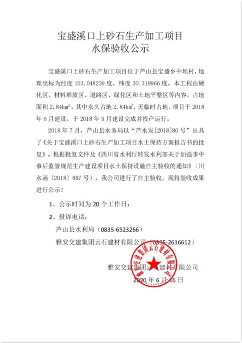 寶盛溪口上砂石生產(chǎn)加工項目水保驗收公示