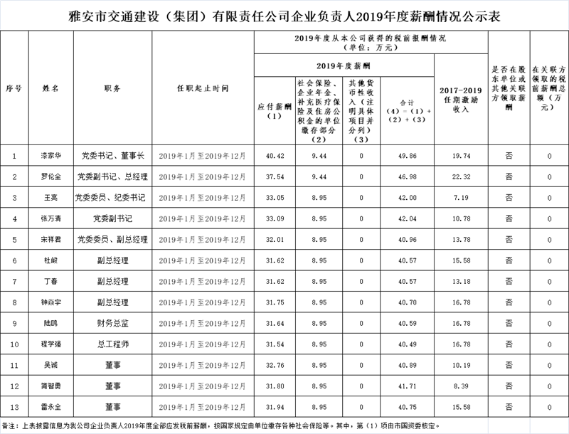 雅安市交通建設(shè)(集團)有限責(zé)任公司企業(yè)負(fù)責(zé)人2019年度薪酬情況公示表