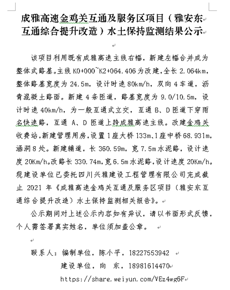 成雅高速金雞關(guān)互通及服務(wù)區(qū)項(xiàng)目(雨名快速通道)水土保持監(jiān)測(cè)結(jié)果公示
